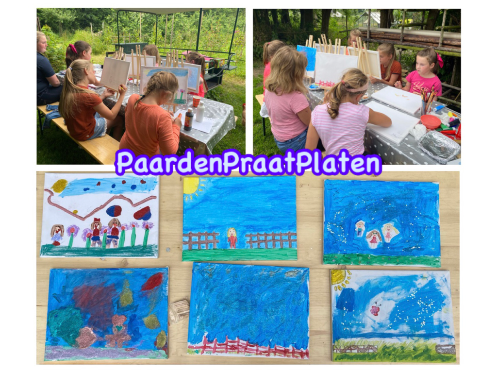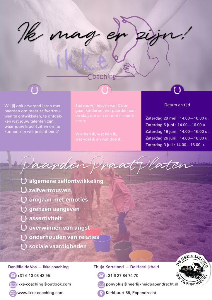 In les 1 starten we met Contact en Verbinding maken met elkaar en de pony’s. In les 2 gaan we aan de slag met het begrip Ordening en je eigen plek. Wat is jouw plek, grenzen aangeven en omgaan met emoties. In les 3 gaan we ervaren hoe er binnen samenwerking altijd sprake is van Balans in Geven en Nemen. In les 4 mogen de kinderen een eigen ‘PaardenPraatPlaat’ maken. Hierin komt het geleerde van de eerste 3 lessen creatief tot uiting. In les 5 gaan we reflecteren d.m.v. allerlei PaardenPraatPlaten en gaan we vervolgens de beste versie van onszelf aan elkaar presenteren a.d.h.v. onze zelfgemaakte paardenpraatplaat en ervaringen vanuit de lessen. Na afloop krijgen de kinderen een certificaat en mogen ze hun eigen kunstwerk ook mee naar huis nemen.
